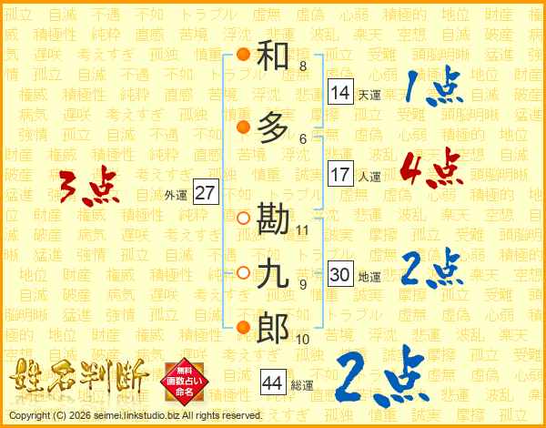 和(8画)多(6画) 勘(11画)九(9画)郎(10画)