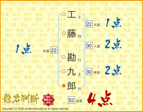 工(3画)藤(19画) 勘(11画)九(9画)郎(10画)
