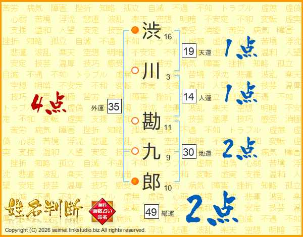 渋(16画)川(3画) 勘(11画)九(9画)郎(10画)
