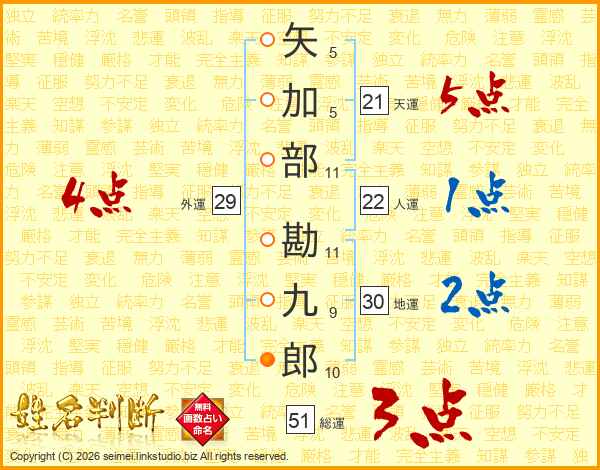 矢(5画)加(5画)部(11画) 勘(11画)九(9画)郎(10画)