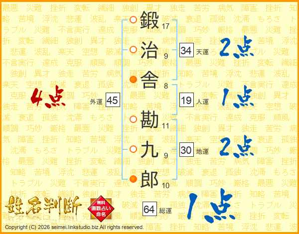 鍛(17画)治(9画)舎(8画) 勘(11画)九(9画)郎(10画)