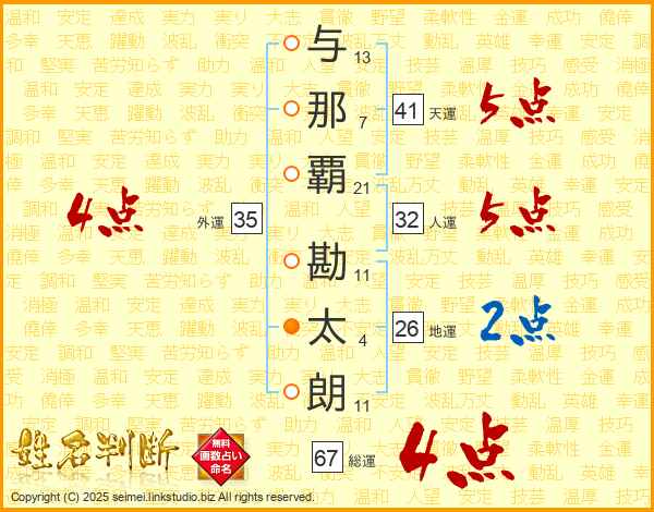 与(13画)那(7画)覇(21画) 勘(11画)太(4画)朗(11画)
