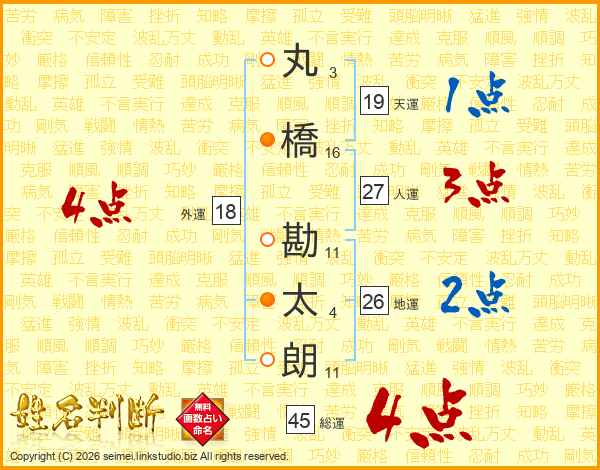 丸(3画)橋(16画) 勘(11画)太(4画)朗(11画)