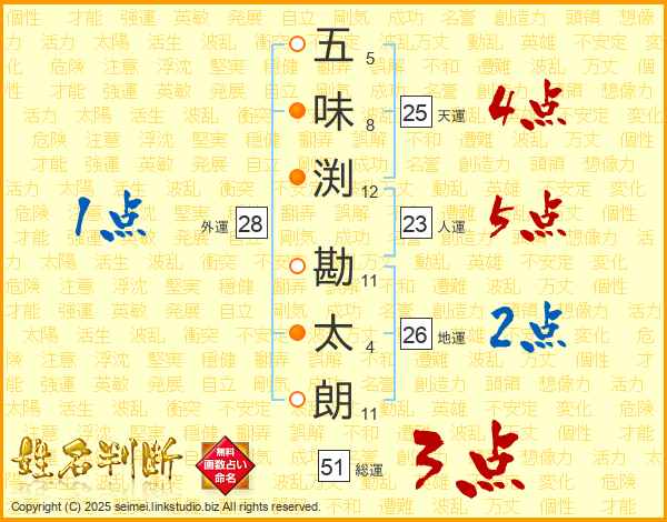 五(5画)味(8画)渕(12画) 勘(11画)太(4画)朗(11画)