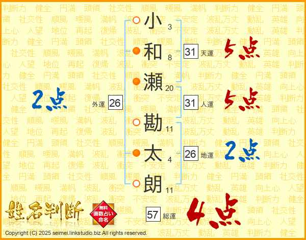 小(3画)和(8画)瀬(20画) 勘(11画)太(4画)朗(11画)