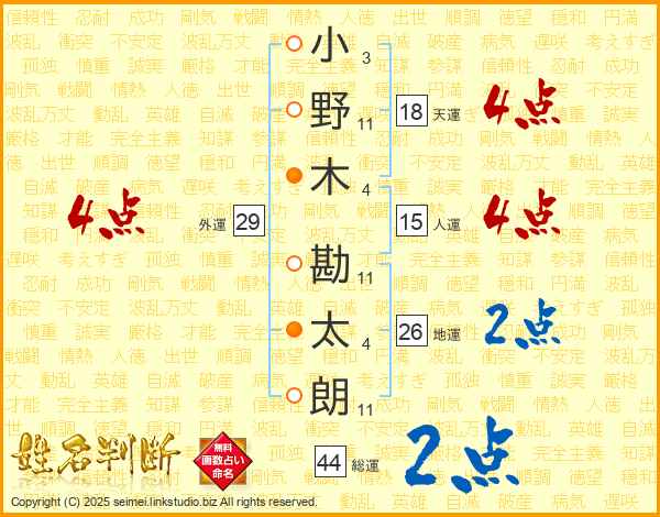 小(3画)野(11画)木(4画) 勘(11画)太(4画)朗(11画)
