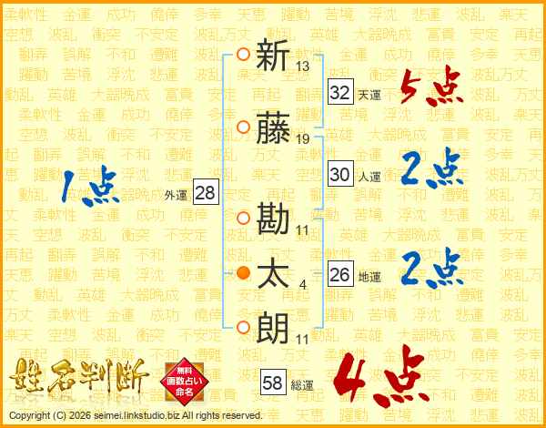 新(13画)藤(19画) 勘(11画)太(4画)朗(11画)