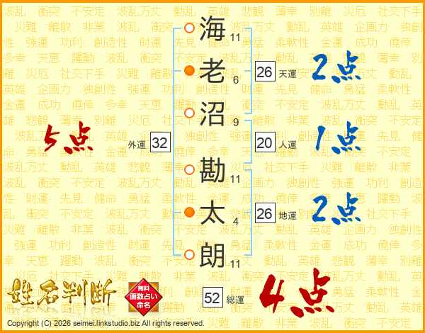 海(11画)老(6画)沼(9画) 勘(11画)太(4画)朗(11画)