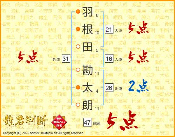羽根田勘太朗さんの天運は21画の5点!