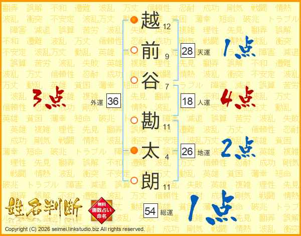 越(12画)前(9画)谷(7画) 勘(11画)太(4画)朗(11画)
