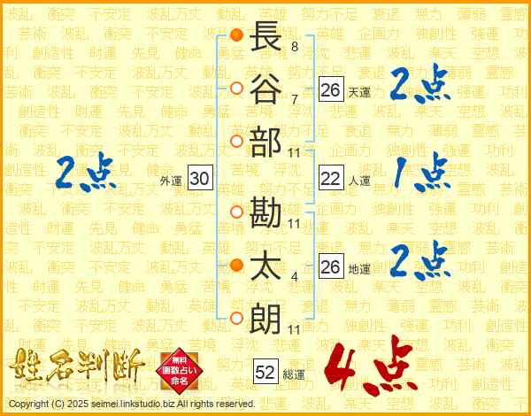 長(8画)谷(7画)部(11画) 勘(11画)太(4画)朗(11画)