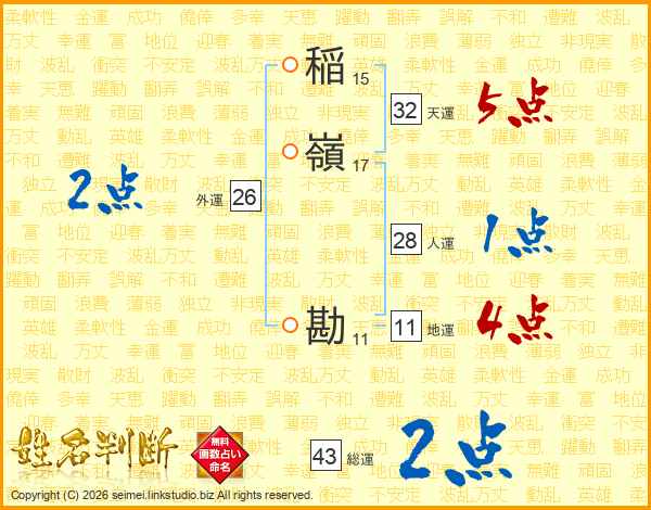 稲嶺勘さんの総運は43画の2点!