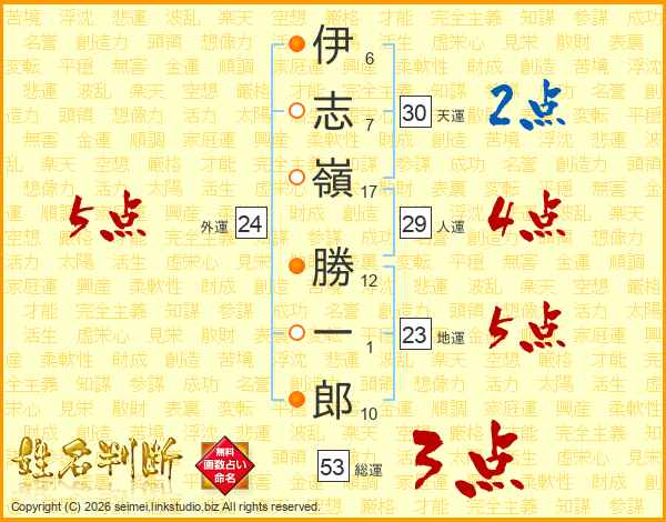 伊(6画)志(7画)嶺(17画) 勝(12画)一(1画)郎(10画)