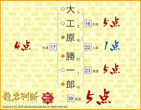 大(3画)工(3画)原(10画) 勝(12画)一(1画)郎(10画)