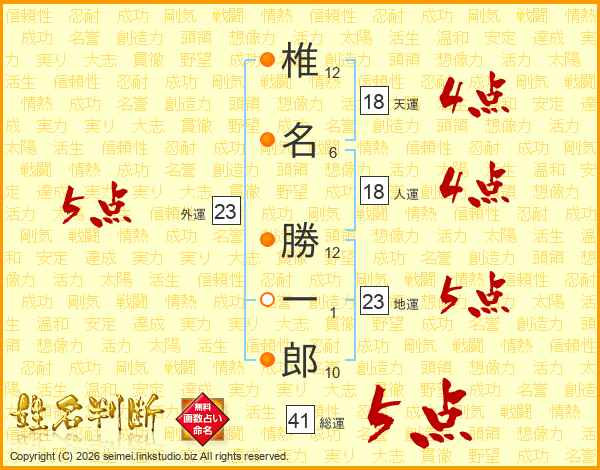椎(12画)名(6画) 勝(12画)一(1画)郎(10画)
