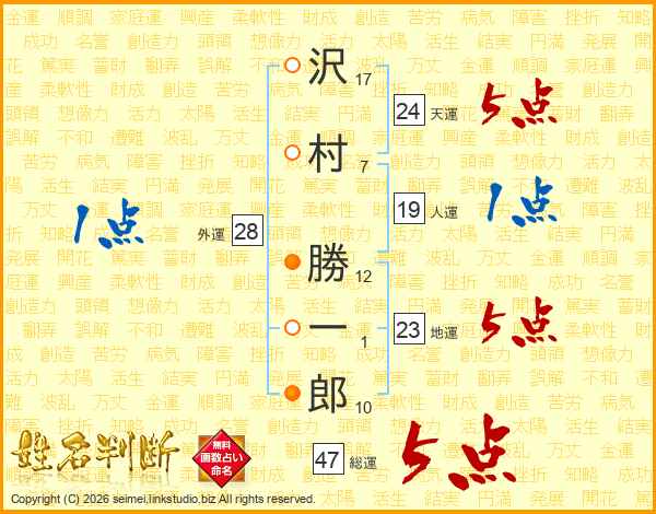 沢(17画)村(7画) 勝(12画)一(1画)郎(10画)