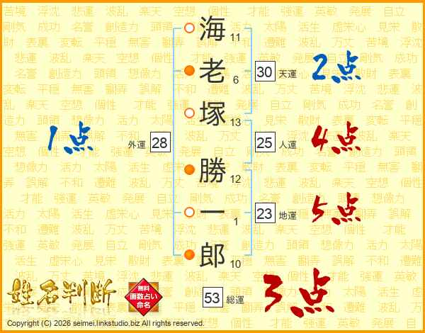 海(11画)老(6画)塚(13画) 勝(12画)一(1画)郎(10画)