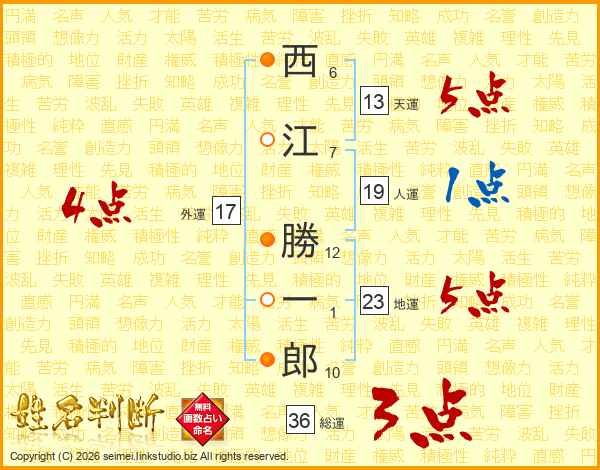 西(6画)江(7画) 勝(12画)一(1画)郎(10画)