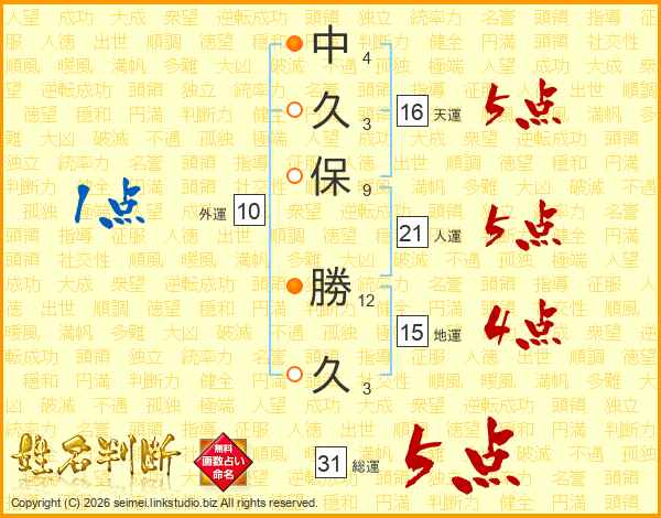 中久保勝久さんの総運は31画の5点!