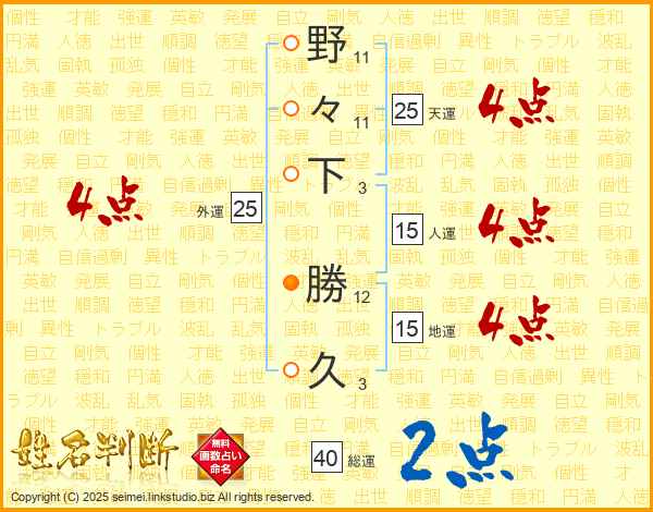 野(11画)々(11画)下(3画) 勝(12画)久(3画)