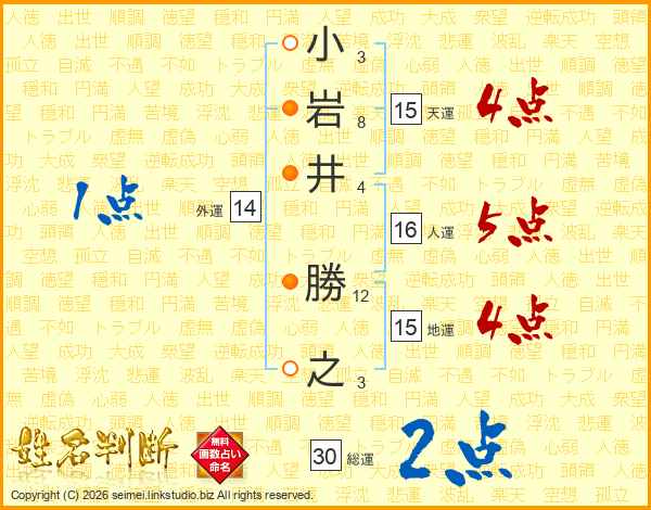 小(3画)岩(8画)井(4画) 勝(12画)之(3画)