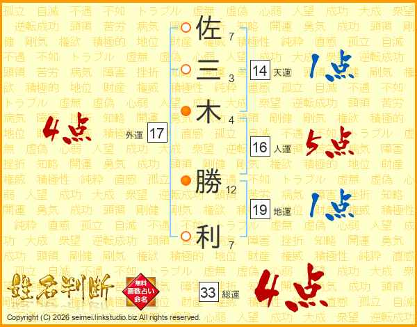 佐(7画)三(3画)木(4画) 勝(12画)利(7画)