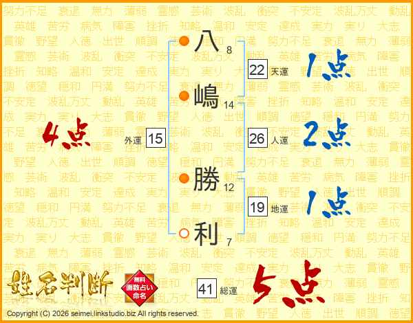 八(8画)嶋(14画) 勝(12画)利(7画)