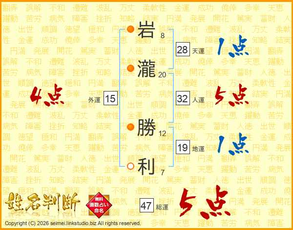 岩(8画)瀧(20画) 勝(12画)利(7画)
