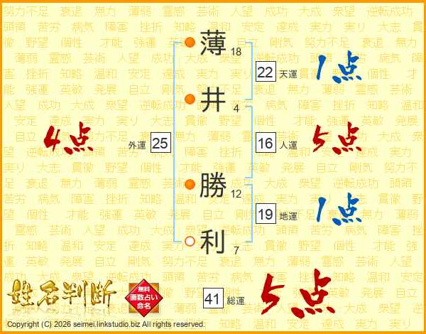 生活面を象徴する運勢です。外部から受ける影響力を表し、結婚運、家庭運や職場、環境への順応性を表します。総運から人運を引いた画数。姓や名が1文字の場合を除く。
