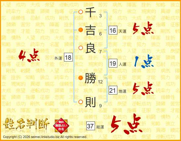 千(3画)吉(6画)良(7画) 勝(12画)則(9画)