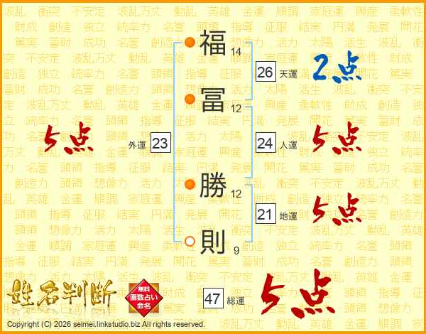 生活面を象徴する運勢です。外部から受ける影響力を表し、結婚運、家庭運や職場、環境への順応性を表します。総運から人運を引いた画数。姓や名が1文字の場合を除く。