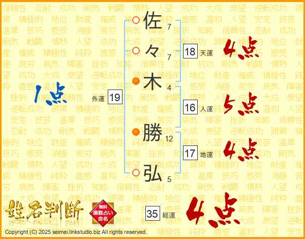 佐々木勝弘さんの天運は18画の4点!