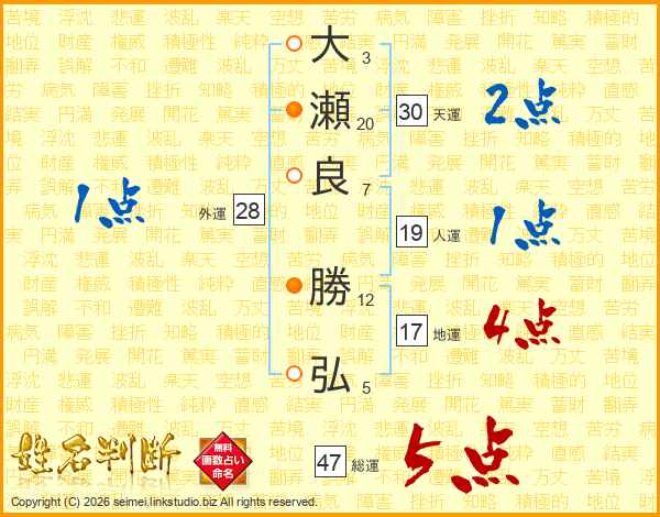 大(3画)瀬(20画)良(7画) 勝(12画)弘(5画)