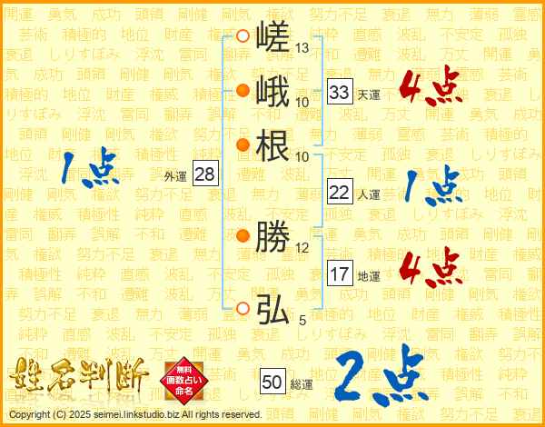 嵯(13画)峨(10画)根(10画) 勝(12画)弘(5画)