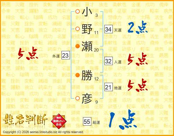小(3画)野(11画)瀬(20画) 勝(12画)彦(9画)