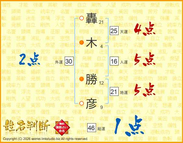 轟(21画)木(4画) 勝(12画)彦(9画)