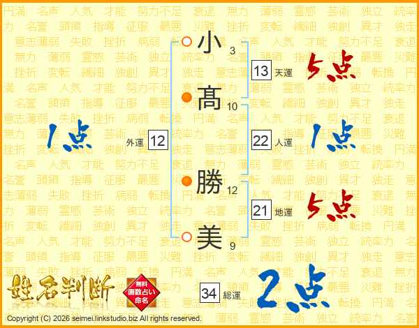 生活面を象徴する運勢です。外部から受ける影響力を表し、結婚運、家庭運や職場、環境への順応性を表します。総運から人運を引いた画数。姓や名が1文字の場合を除く。
