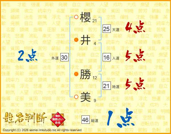 櫻(21画)井(4画) 勝(12画)美(9画)