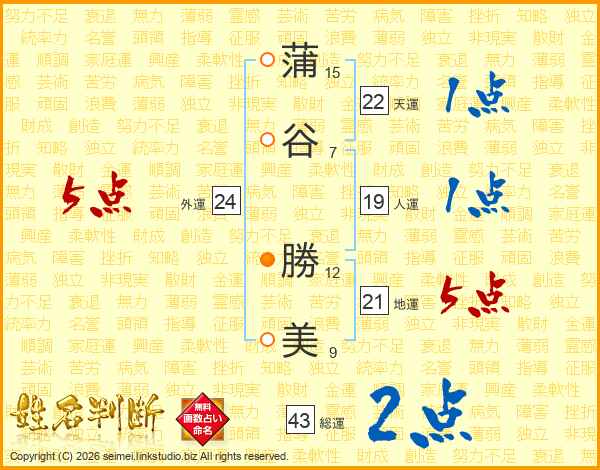 蒲(15画)谷(7画) 勝(12画)美(9画)