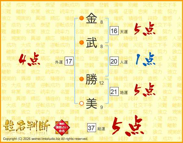 金(8画)武(8画) 勝(12画)美(9画)