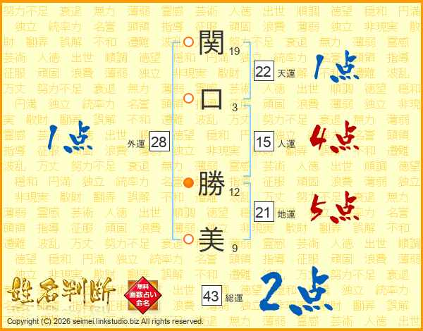 生活面を象徴する運勢です。外部から受ける影響力を表し、結婚運、家庭運や職場、環境への順応性を表します。総運から人運を引いた画数。姓や名が1文字の場合を除く。