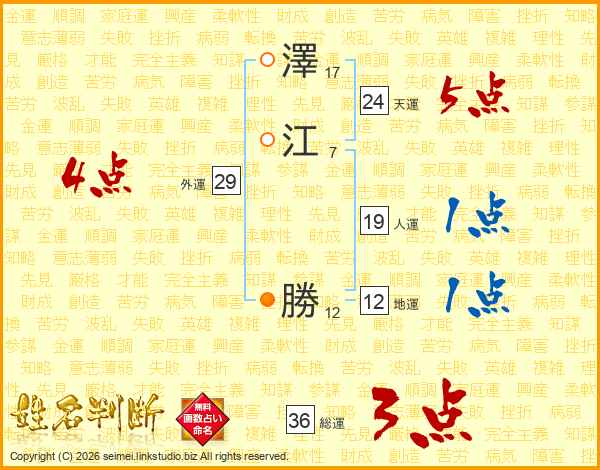 生活面を象徴する運勢です。外部から受ける影響力を表し、結婚運、家庭運や職場、環境への順応性を表します。総運から人運を引いた画数。姓や名が1文字の場合を除く。