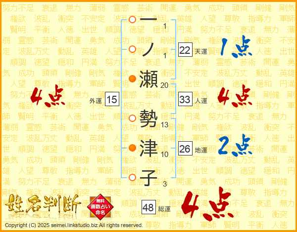 一(1画)ノ(1画)瀬(20画) 勢(13画)津(10画)子(3画)