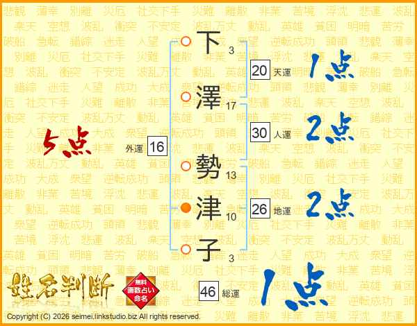 下(3画)澤(17画) 勢(13画)津(10画)子(3画)