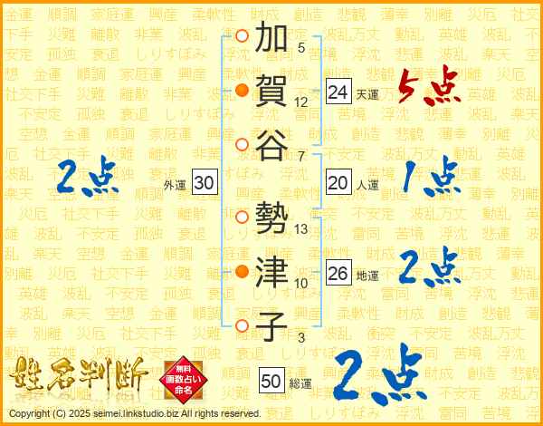 加(5画)賀(12画)谷(7画) 勢(13画)津(10画)子(3画)