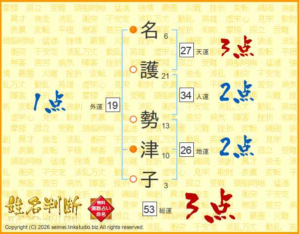 名(6画)護(21画) 勢(13画)津(10画)子(3画)