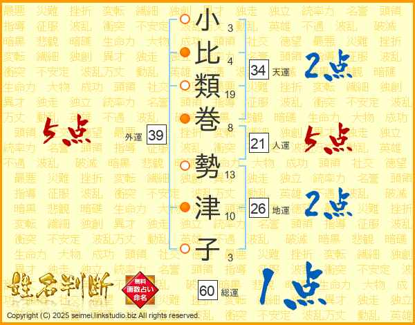 小(3画)比(4画)類(19画)巻(8画) 勢(13画)津(10画)子(3画)