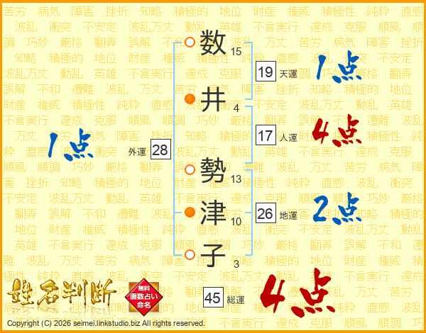 数(15画)井(4画) 勢(13画)津(10画)子(3画)