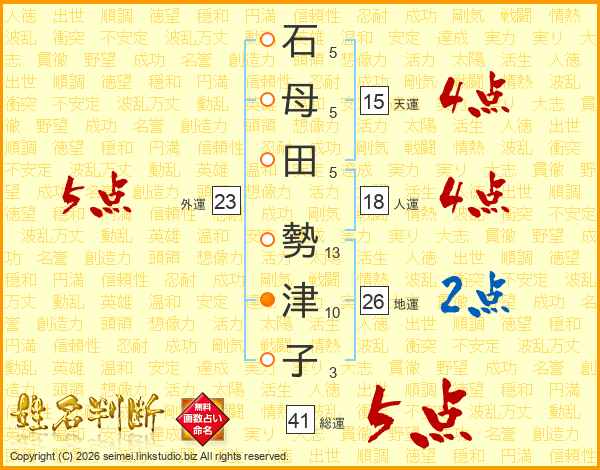 石(5画)母(5画)田(5画) 勢(13画)津(10画)子(3画)