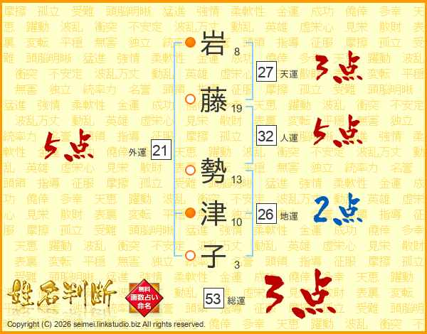 岩(8画)藤(19画) 勢(13画)津(10画)子(3画)